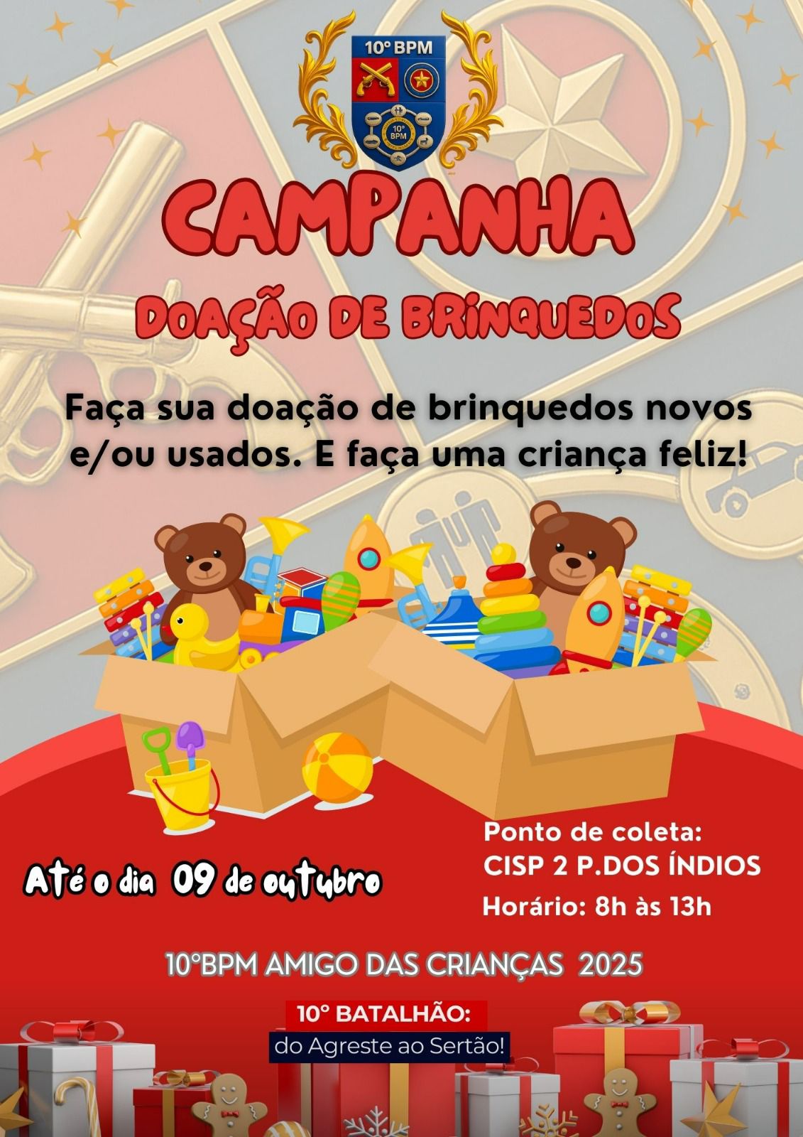 O 10º Batalhão de Polícia Militar (10º BPM), sediado em Palmeira dos Índios,  deu início à campanha de arrecadação de brinquedos que serão destinados a crianças em situação de vulnerabilidade social.
