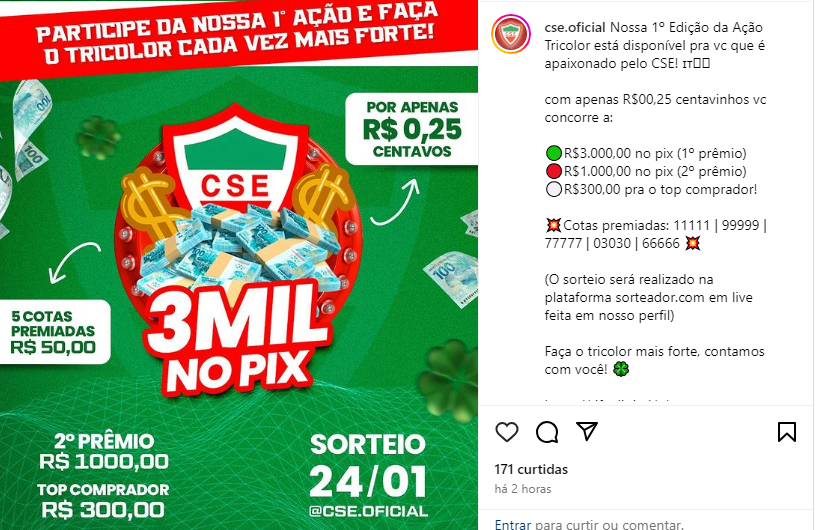 Através de suas redes sociais, o CSE divulgou uma Ação Tricolor, que está disponível para que o torcedor possa ajudar o clube conseguir recursos. Com apenas R$ 0,25 centavos, o torcedor tricolor concorre a: