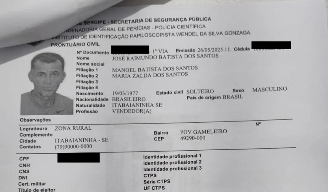 De acordo com o termo pericial, José Raimundo, natural de Itabaianinha, Sergipe, era filho de Manoel Batista dos Santos e Maria Zalda dos Santos. Nascido em 19 de março de 1977, ele residia na zona rural do povoado Gameleira, em sua cidade natal. Suas características físicas foram descritas como pele parda, cabelos grisalhos e olhos castanhos.