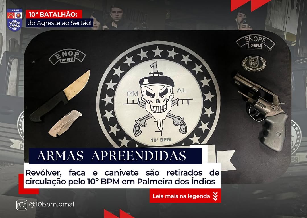 Na noite da última quinta-feira (18), policiais militares do 10º Batalhão apreenderam um revólver calibre .38 e duas armas brancas durante a Operação Hamelin, realizada em Palmeira de Fora, município de Palmeira dos Índios. A ação contou com o apoio das guarnições do Supervisor, do Pelopes e do Tático Urbano 01.