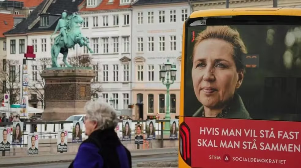 Um cartaz da primeira-ministra dinamarquesa Mette Frederiksen afixado em um ônibus em Copenhague, Dinamarca. Em 23 de março de 2026. © — Foto: Sergei Grits / AP