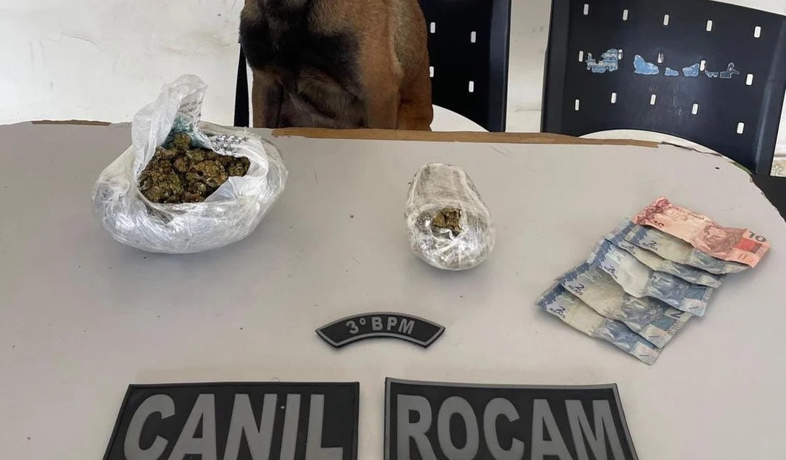 Durante a abordagem, nenhum material ilícito foi encontrado com o condutor. Na busca veicular, realizada com o auxílio do cão farejador K9 Bereta, os policiais localizaram duas bolsas no banco traseiro do carro contendo substância análoga à maconha.