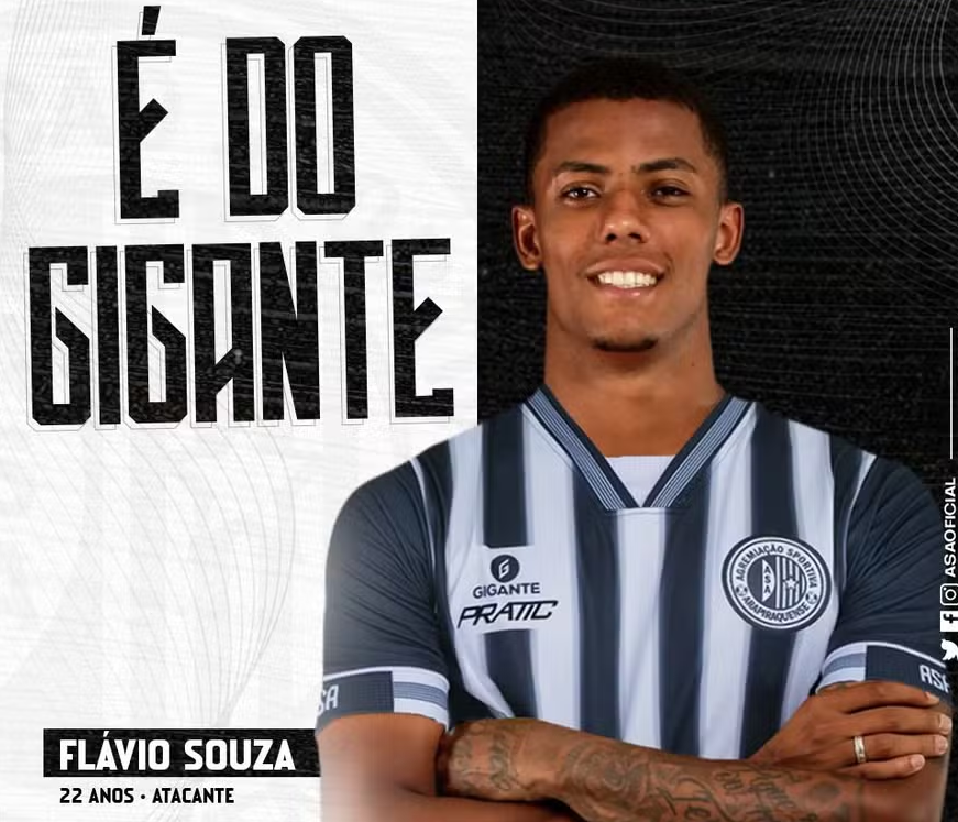 A direção do ASA anunciou, nesta terça-feira (23), a contratação do atacante Flávio Souza, revelado pelo Sport-PE. O atacante de 22 anos também tem passagens por Penapolense-SP e América-RN, onde foi campeão Potiguar em 2023.  O presidente Rogério Siqueira destacou que ele chega pronto para atuar pelo Gigante, pois estava em atividade e realizou a pré-temporada em seu último clube.