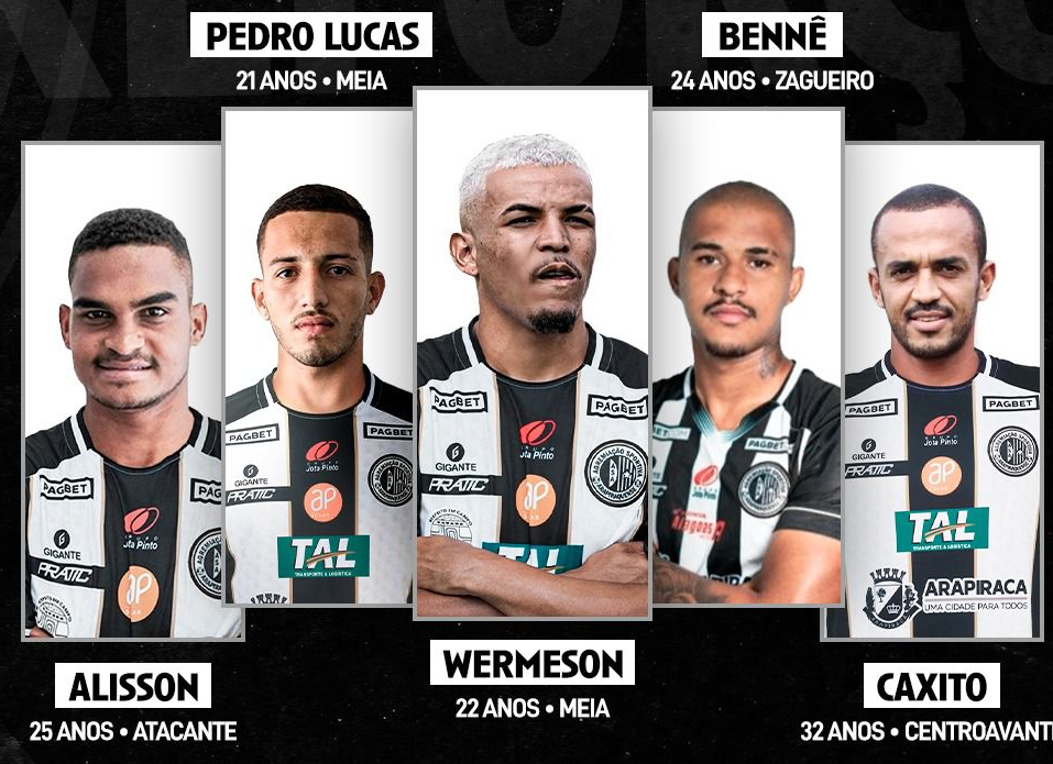 A vice-presidência de Futebol do ASA anunciou, na manhã desta terça-feira (24), a contratação de mais cinco jogadores para a temporada 2024: são eles o zagueiro Benedito Pereira da Silva Neto, o Bennê, 24 anos; o volante Pedro Lucas Silva Santos, 21; o meia-atacante Wermeson do Carmo Silva, 22; e os atacantes Alisson Vicente da Silva, o Alisson Araçoiaba, 25; e Jeferson Luiz da Silva Caetano, o Caxito, 32 anos.