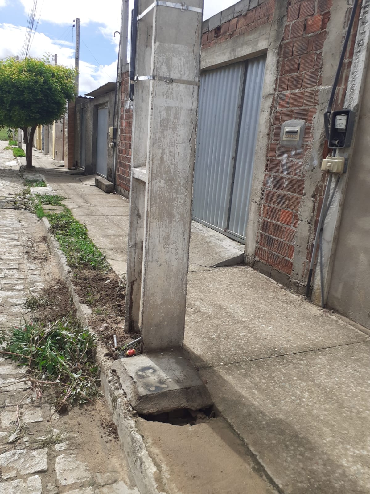 Os moradores do Conjunto Edval Gaia também relataram que um poste de energia está rachado e cada dia que passa ele fica mais inclinado.