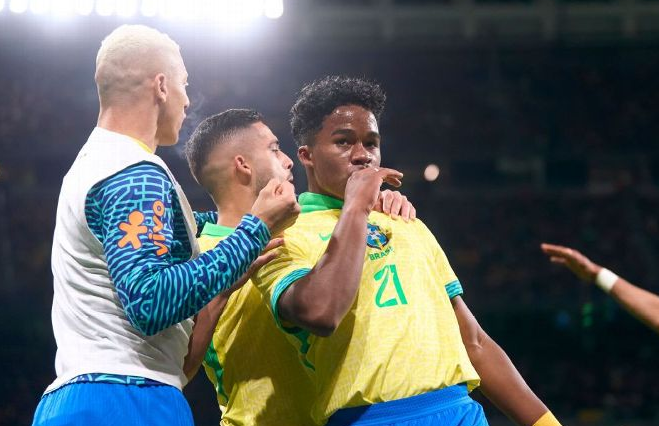 Endrick comemora gol de empate do Brasil contra a Espanha Mateo Villalba/Getty Images