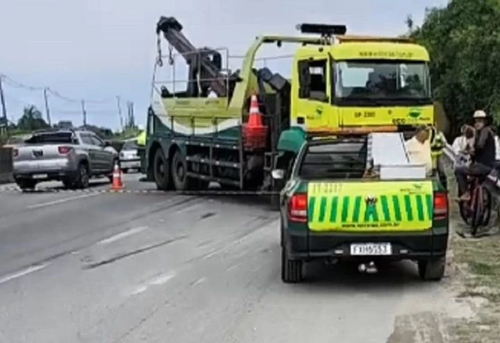 Uma família de três pessoas morreu esmagada após uma carreta tombar e cair sobre o veículo das vítimas na rodovia Padre Manoel da Nóbrega, em São Vicente (SP), neste sábado (19).