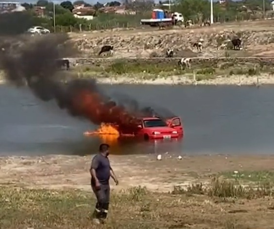 Diante da situação, o veículo acabou sendo empurrado e lançado dentro de uma barragem próxima, na tentativa de apagar o incêndio.