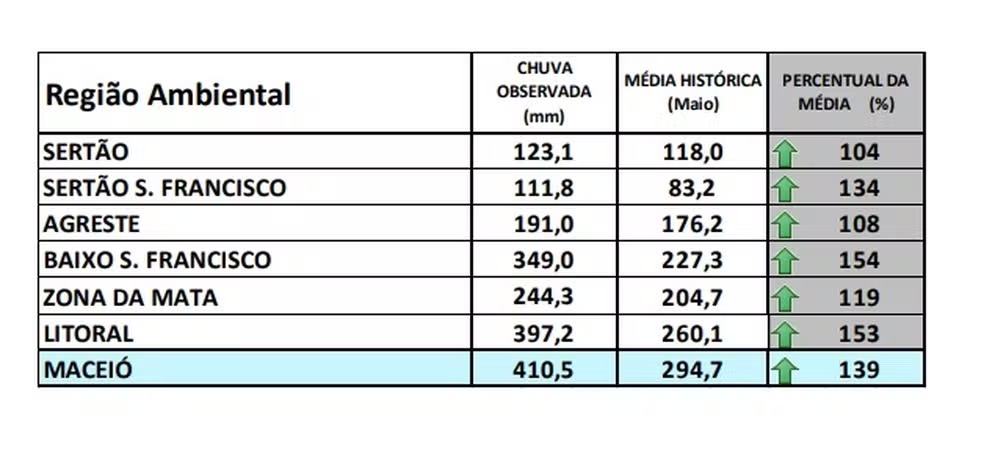 No litoral alagoano, a média é de 260,1 mm, só que no mês de maio deste ano foram registrados 397,2 mm, ou seja 153% de aumento.