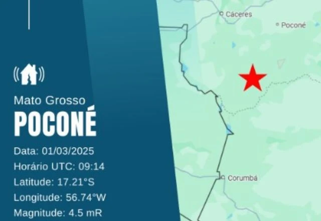 A cidade de Poconé, no Mato Grosso registrou um terremoto de magnitude 4.5 na escala Richter. O tremor foi identificado pelo Centro de Sismologia da USP, às 5h14, no sábado (01). Ele pode ter sido sentido em um raio de até 100 quilômetros.
