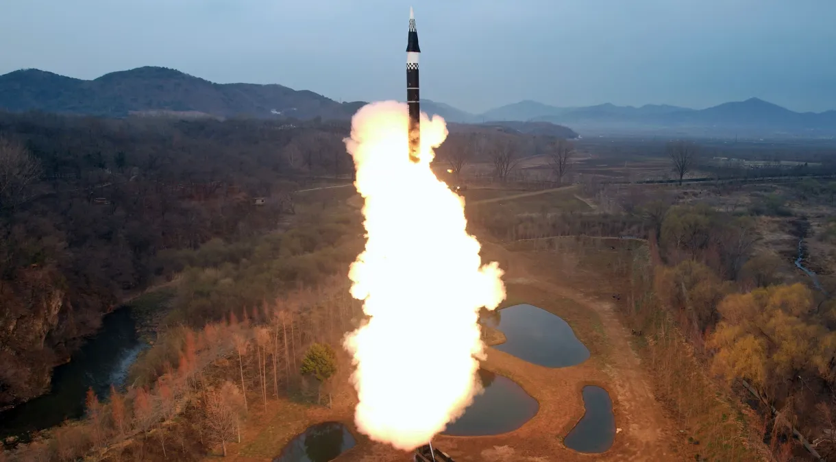 Míssil é lançado, conforme mídia estatal relata que Coreia do Norte testou novo míssil hipersônico de combustível sólido de médio a longo alcance, em local desconhecido na Coreia do Norte, em foto divulgada pela Agência Central de Notícias da Coreia