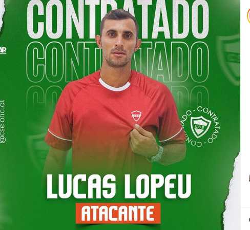 A direção do CSE anunciou a contratação do centroavante Lucas Lopeu, 31 anos, que estava no Sousa (PB). É o 14º jogador anunciado pelo tricolor, que segue seu planejamento para a temporada 2024.