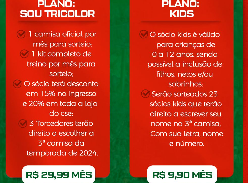 Para quem quiser aderir ao plano Sou Tricolor, o valor mensal é de R$ 29,99. Essa categoria oferece uma camisa oficial por mês para sorteio; 1 kit completo de treino por mês para sorteio; o sócio terá 15% de desconto no ingresso e 20% em toda loja do CSE. Além disso, três torcedores terão direito a escolher a 3ª camisa da temporada 2024.