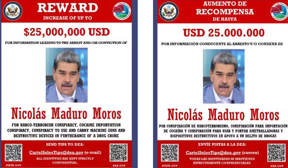 O Departamento da Justiça dos Estados Unidos divulgou na segunda-feira (28) uma recompensa de US$ 25 milhões (cerca de R$ 140 milhões) para quem tiver informações "que levem à prisão e/ou condenação" de Nicolás Maduro, presidente da Venezuela.