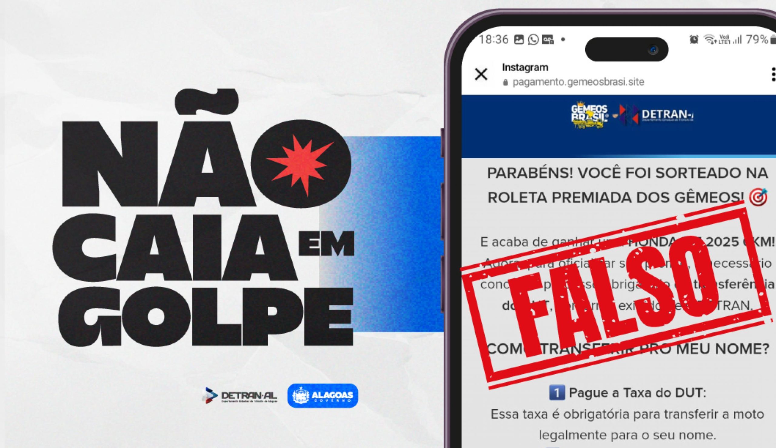 Além das mensagens de texto e e-mails, outra modalidade que os golpistas tentam aplicar nos usuários é uma página falsa de leilão de veículos, como um perfil falso no Instagram. Outro link divulga um falso sorteio de motocicletas utilizando de má-fé o nome do Detran Alagoas. Para todos os casos citados, os usuários devem acessar o site oficial do Detran Alagoas (www.detran.al.gov.br) ou procurar o atendimento presencial em qualquer unidade do órgão estadual para checar as informações oficiais.