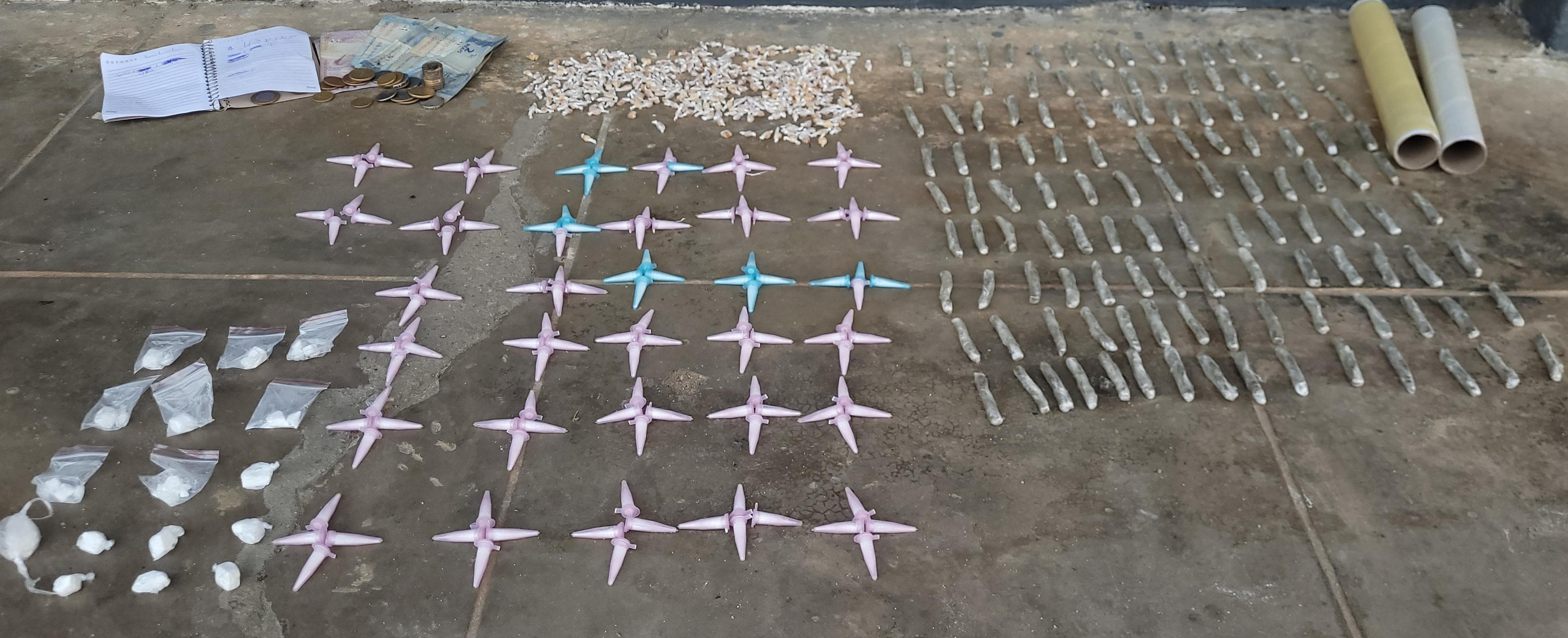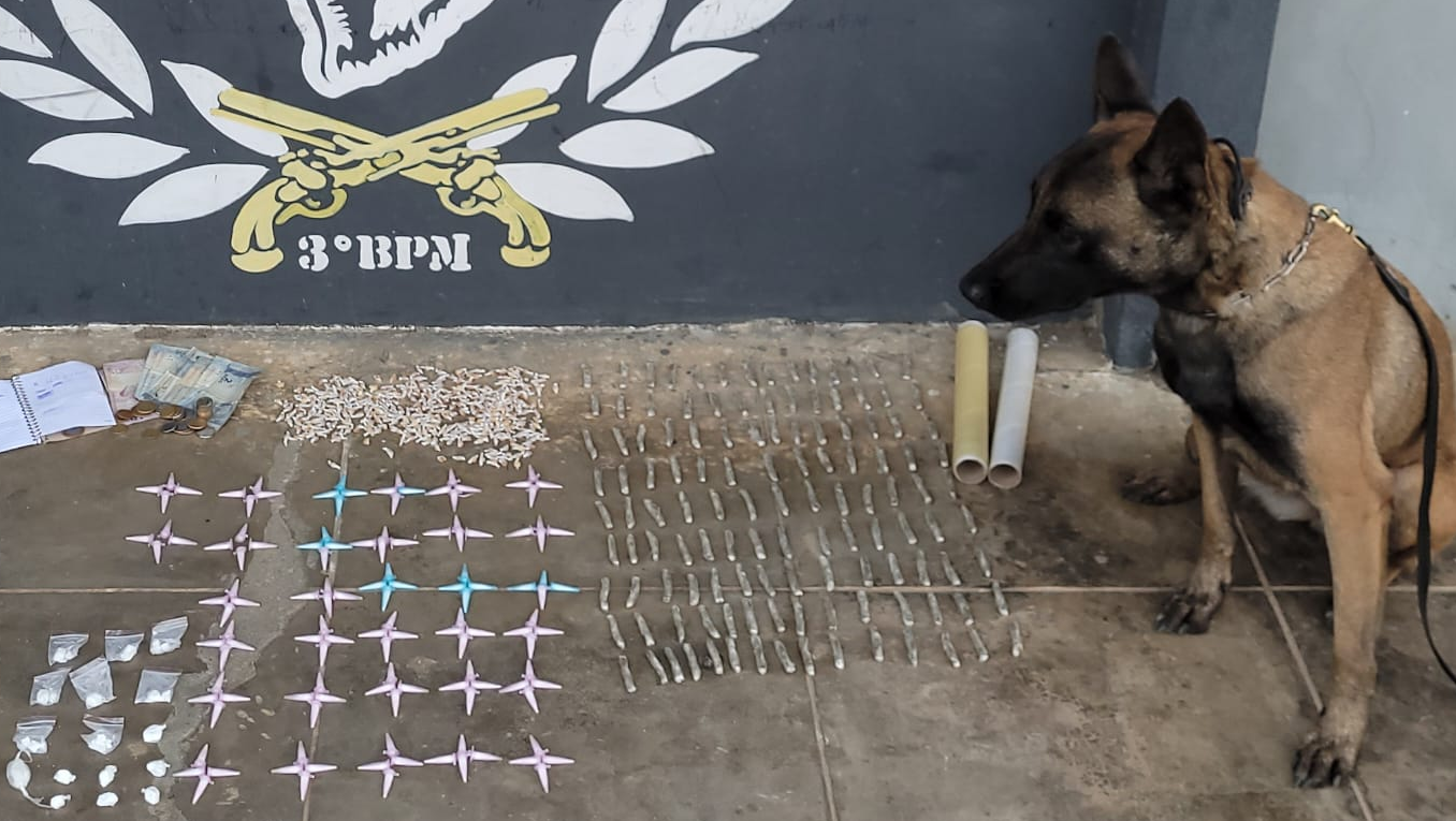 De acordo com o relatório da PM, os suspeitos estavam em uma residência abandonada na conhecida Rua da Lagoa. Os dois foram abordados e, com o apoio do cão farejador K9 Bereta, foram encontradas 426 pedras de crack, 144 pinos de cocaína, 117 bombinhas de maconha, uma caderneta de anotações, celular e uma quantia em dinheiro.