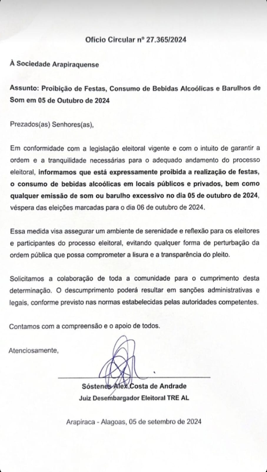 O Núcleo de Enfrentamento à Desinformação (NED) do Tribunal Regional Eleitoral de Alagoas (TRE/AL) esclarece que é falso conteúdo que circula nas redes sociais, determinando a proibição da realização de festas, o consumo de bebidas alcoólicas em locais públicos e privados, e utilização de som ou barulho no dia 05 de outubro, véspera da eleição municipal, em Arapiraca.