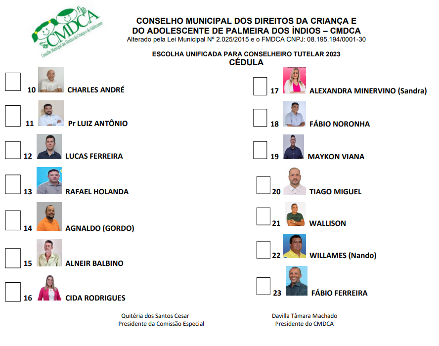 Este ano, foram habilitadas as candidaturas de 14 candidatos ao Conselho Tutelar, sendo eles Agnaldo Tenório de Barros, Alexsandra Minervino da Costa Tenório, Auneir Faustino Balbino, Charles André Bezerra Silva, Cleiton Rafael Holanda Ferreira, Fábio da Silva Ferro, Fábio Washington Noronha, Lucas Barbosa da Rocha, Luiz Antônio da Silva Moura, Maria Aparecida da Silva Rodrigues, Maykon Viana Santos, Tiago José Silva da Costa, Williames Freitas da Silva e Wallison Cícero de Oliveira Souto.