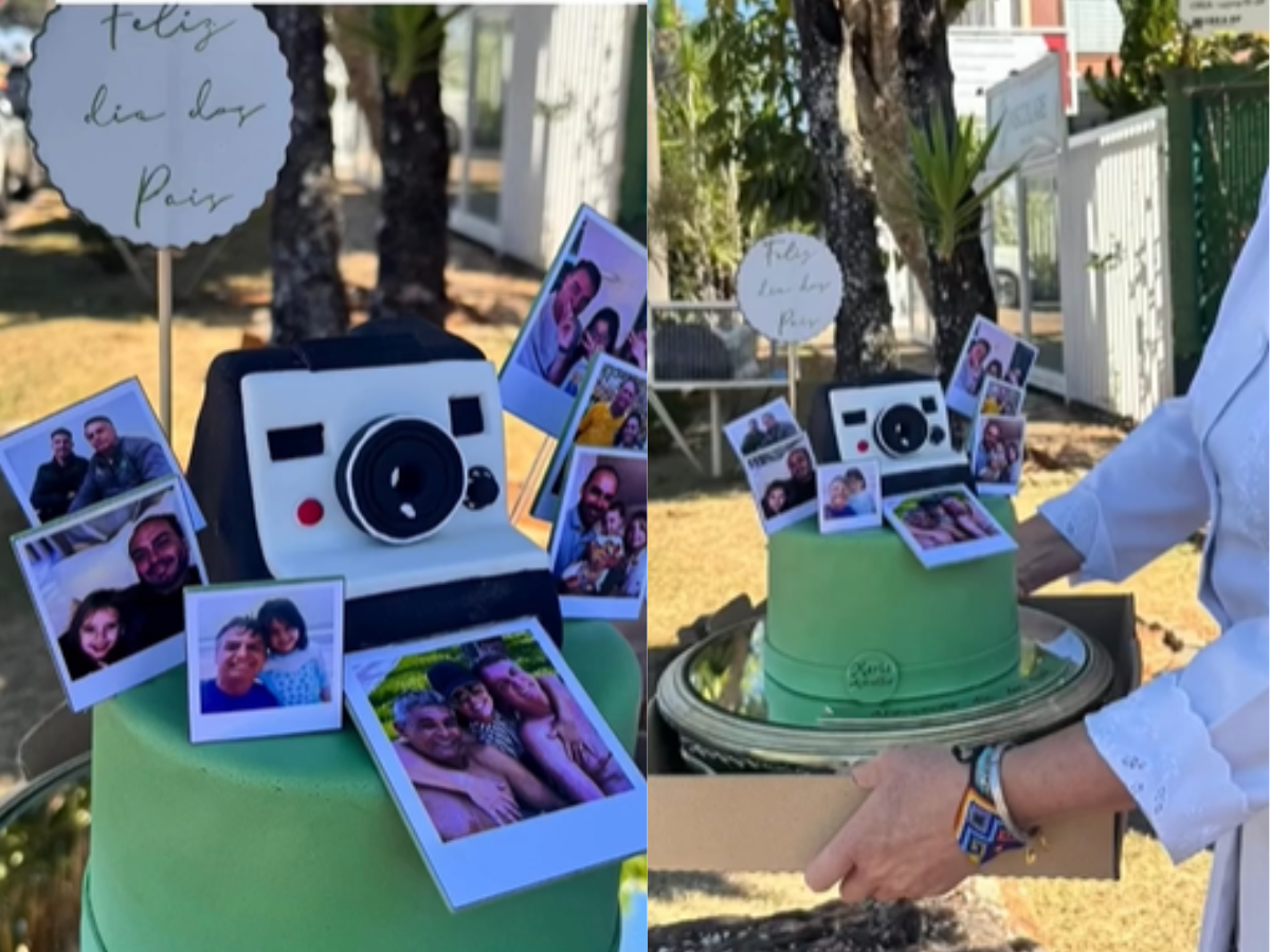 O presente entregue foi um bolo produzido pela confeitaria Maria Amélia Doces, situada em frente ao condomínio. A peça, coberta com pasta verde, trazia imagens de Bolsonaro ao lado dos filhos, compondo a decoração temática para a data comemorativa.