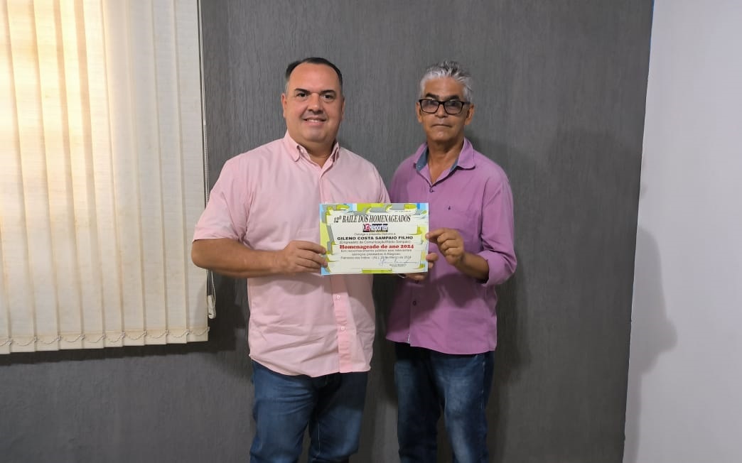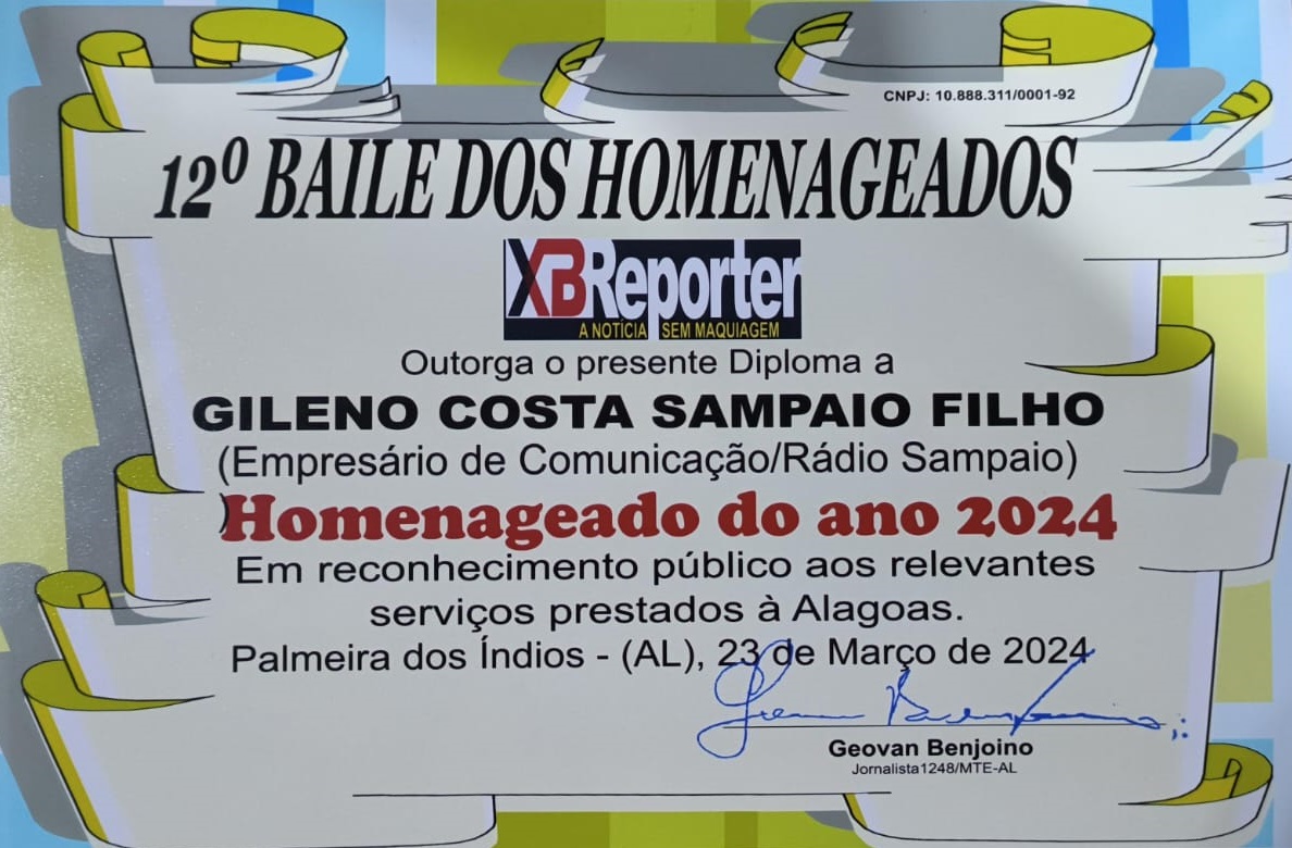 A homenagem foi entregue pelo jornalista Geovan Benjoino, do portal XBreporter, durante o Baile dos Homenageados, que ocorreu no sábado (23), na AABB, em Palmeira dos Índios. Gileninho Sampaio foi o homenageado do ano na categoria “Empresário de Comunicação”.