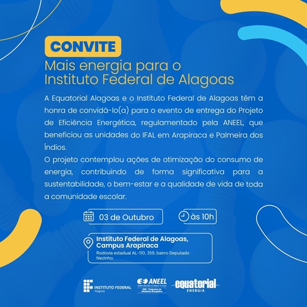A Equatorial Alagoas promove, nesta sexta-feira (3), às 10h, a solenidade de entrega do Projeto de Eficiência Energética no Instituto Federal de Alagoas (IFAL), Campus Arapiraca. A iniciativa, regulamentada pela ANEEL, também contemplou a unidade do IFAL em Palmeira dos Índios.
