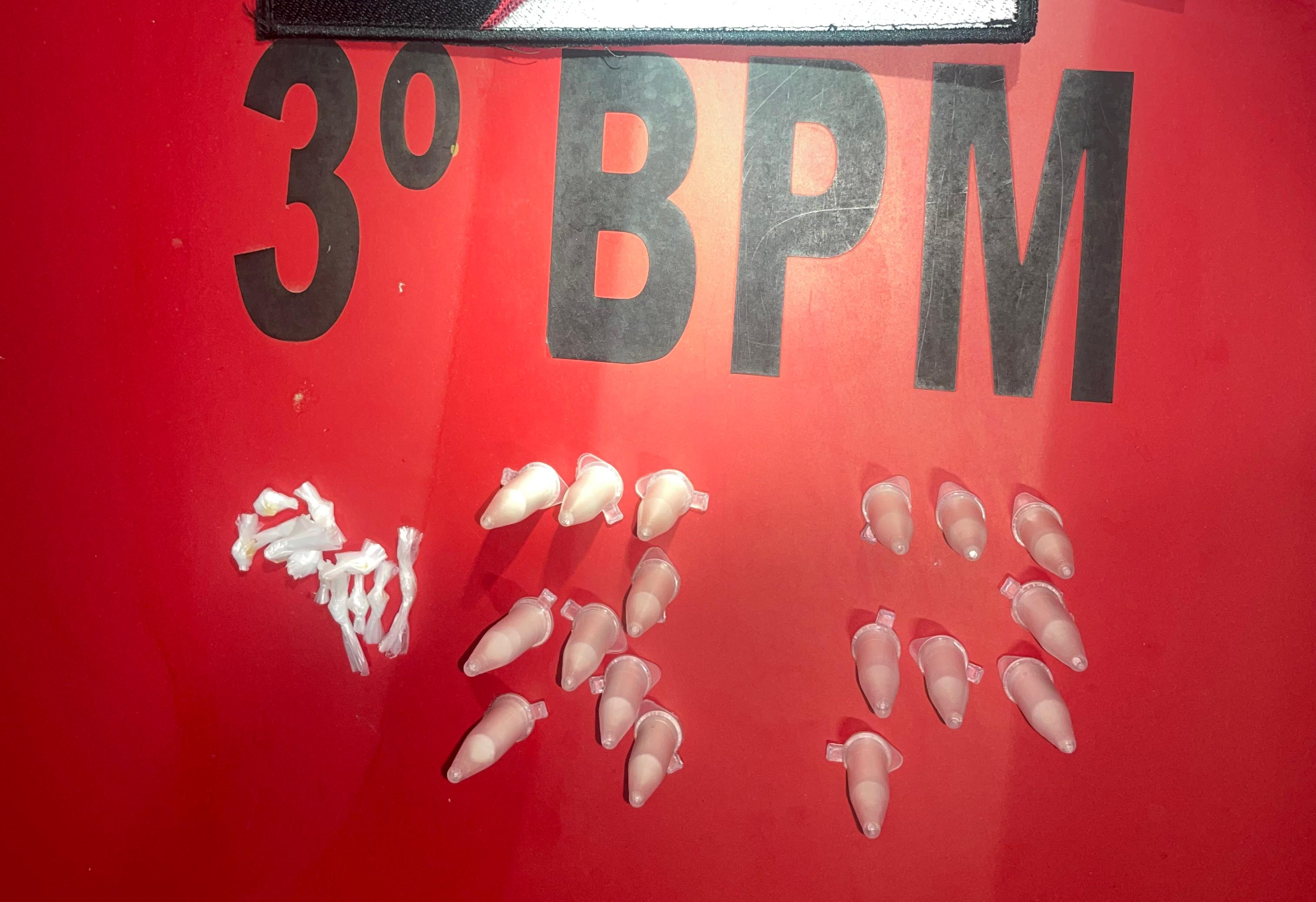 Com ele, os PMs apreenderam 17 pinos de substância análoga a cocaína e 12 pedras de substância análoga ao crack.