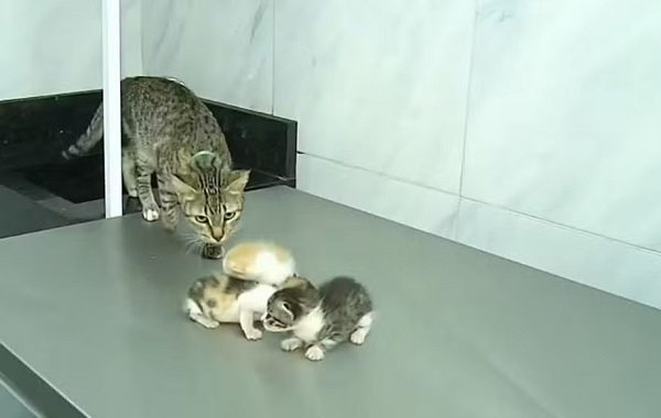 Após deixar o filhote morto na clínica, a gata saiu e minutos depois retornou, trazendo de um por um, outros três filhotes que estavam vivos. Mãe e filhotes foram acolhidos e passaram por avaliação.