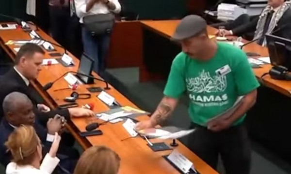 Nas imagens capturadas pela TV e armazenada no YouTube da Casa, é possível ver o homem entregando panfletos a parlamentares presentes à sessão da Comissão de Legislação Participativa que discutia a crise humanitária vivida na Faixa de Gaza.