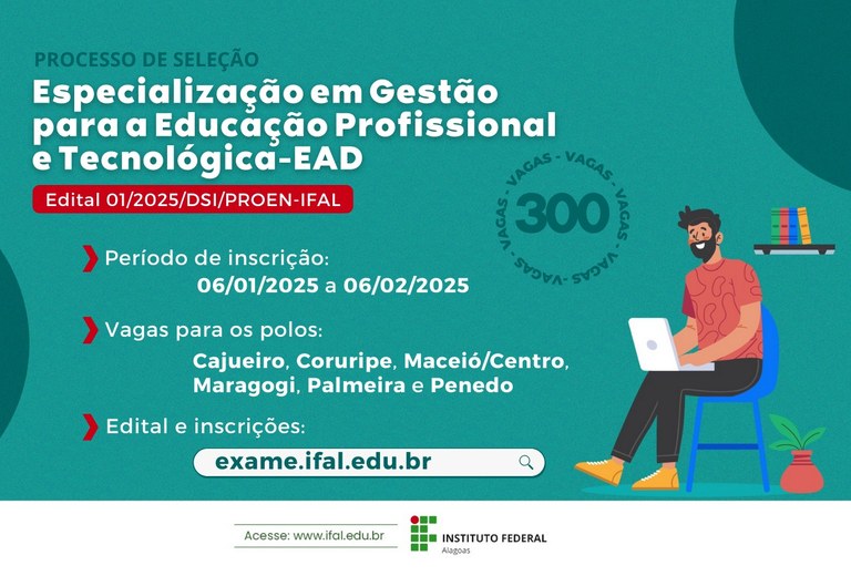 Começam nesta segunda-feira (6), as inscrições para a especialização em Gestão para Educação Profissional e Tecnológica na modalidade a distância. O Instituto Federal de Alagoas (Ifal) publicou o edital nº 01/2025, que concede 300 vagas para a especialização, em seis polos de Alagoas. O polo de Palmeira dos Índios ofertará 50 vagas.