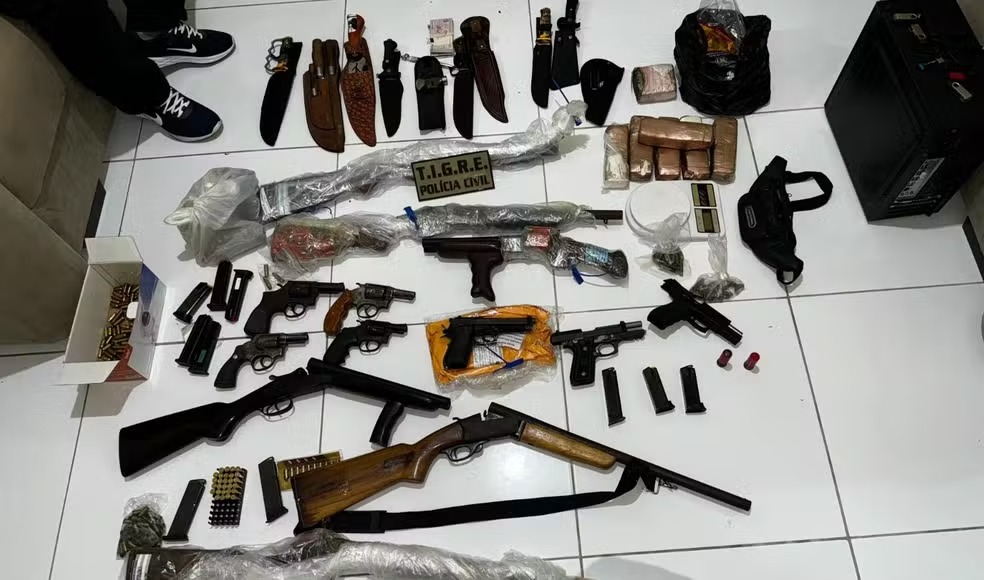 Durante a prisão na operação, os policiais apreenderam cerca de 3kg de drogas, armas e munições. O material foi encontrado na casa de um dos investigados.