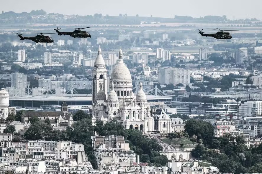 Aeronaves realizam sobrevoo da Basílica de Sacré-Coeur durante desfile militar anual do Dia da Bastilha, em Paris — Foto: Thibaud MORITZ/AFP