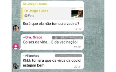 Em seguida, outra profissional, que seria Grace Mônica Alvim Coelho, comenta: ‘Coisas da vida… E da vacinação!’. Por fim, outro médico, Nilton Chaves, acrescenta: "Tomara que o vírus da Covid esteja bem." Grace já foi secretária de Saúde do Acre entre 1999 a 2004, na gestão de Jorge Viana.