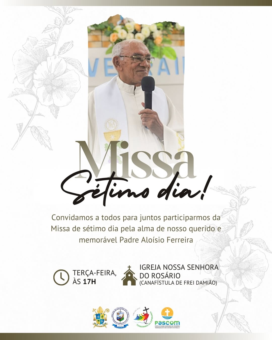Toda a população de Palmeira dos Índios e região está convidada a participar da celebração da Santa Missa de sétimo dia em homenagem ao padre Aloísio Ferreira dos Santos, marcada para esta terça-feira (07), às 17 horas, na Igreja de Nossa Senhora do Rosário, em Canafístula de Frei Damião.