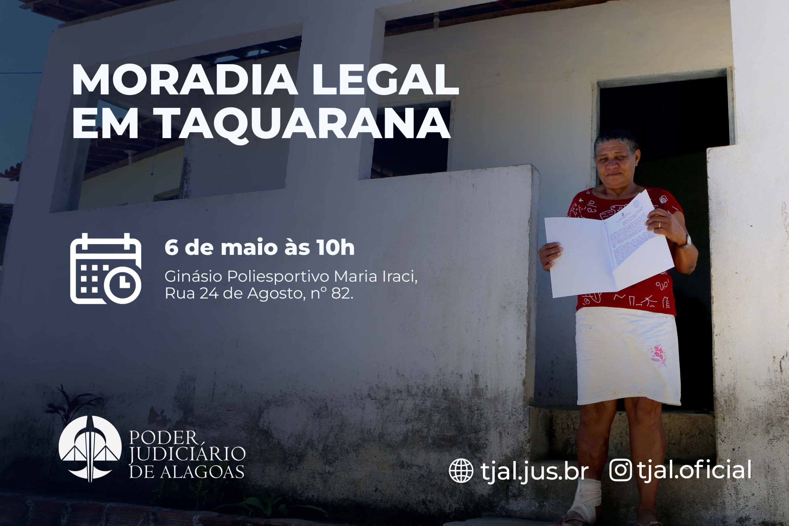 O programa Moradia Legal do Judiciário de Alagoas beneficiará, nesta segunda (6), 109 famílias de baixa renda de Taquarana. A entrega dos títulos do programa de regularização fundiária terá início às 10h, no Ginásio Poliesportivo Maria Iraci, Rua 24 de Agosto, 82, Taquarana.