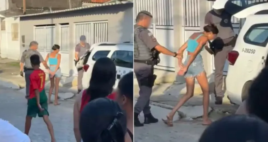 Mulher foi hostilizada pela população enquanto era colocada pelos policiais dentro da viatura em São Vicente. Foto: Redes Sociais