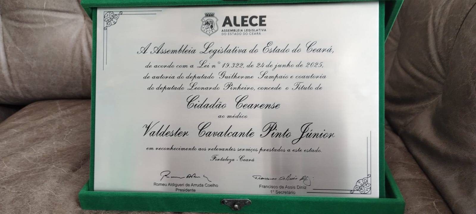 Em uma sessão extraordinária marcada por emoção, a Assembleia Legislativa do Estado do Ceará entregou, na noite desta quinta-feira (14), o título de cidadão cearense ao médico natural de Palmeira dos Índios, Valdester Cavalcante Pinto Júnior. A homenagem foi proposta pelo deputado Guilherme Sampaio e aprovada por unanimidade pelo plenário.