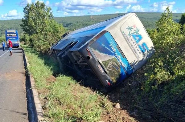Nesse momento, o motorista do ônibus conseguiu desviar do que poderia ter sido uma colisão frontal e acabou tombando às margens da BR-251.