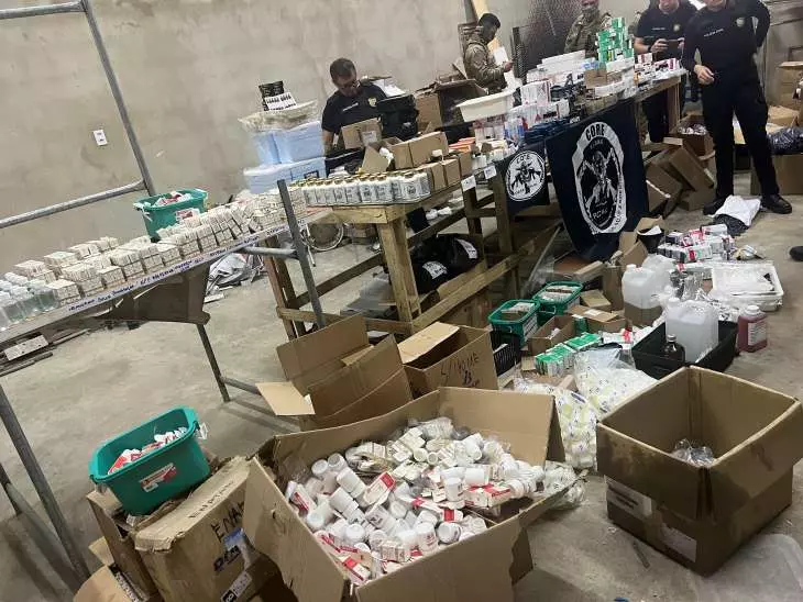 De acordo com as imagens fornecidas pela Polícia Civil, houve apreensão de uma grande quantidade de medicamentos em uma central improvisada de distribuição, incluindo canetas emagrecedoras.