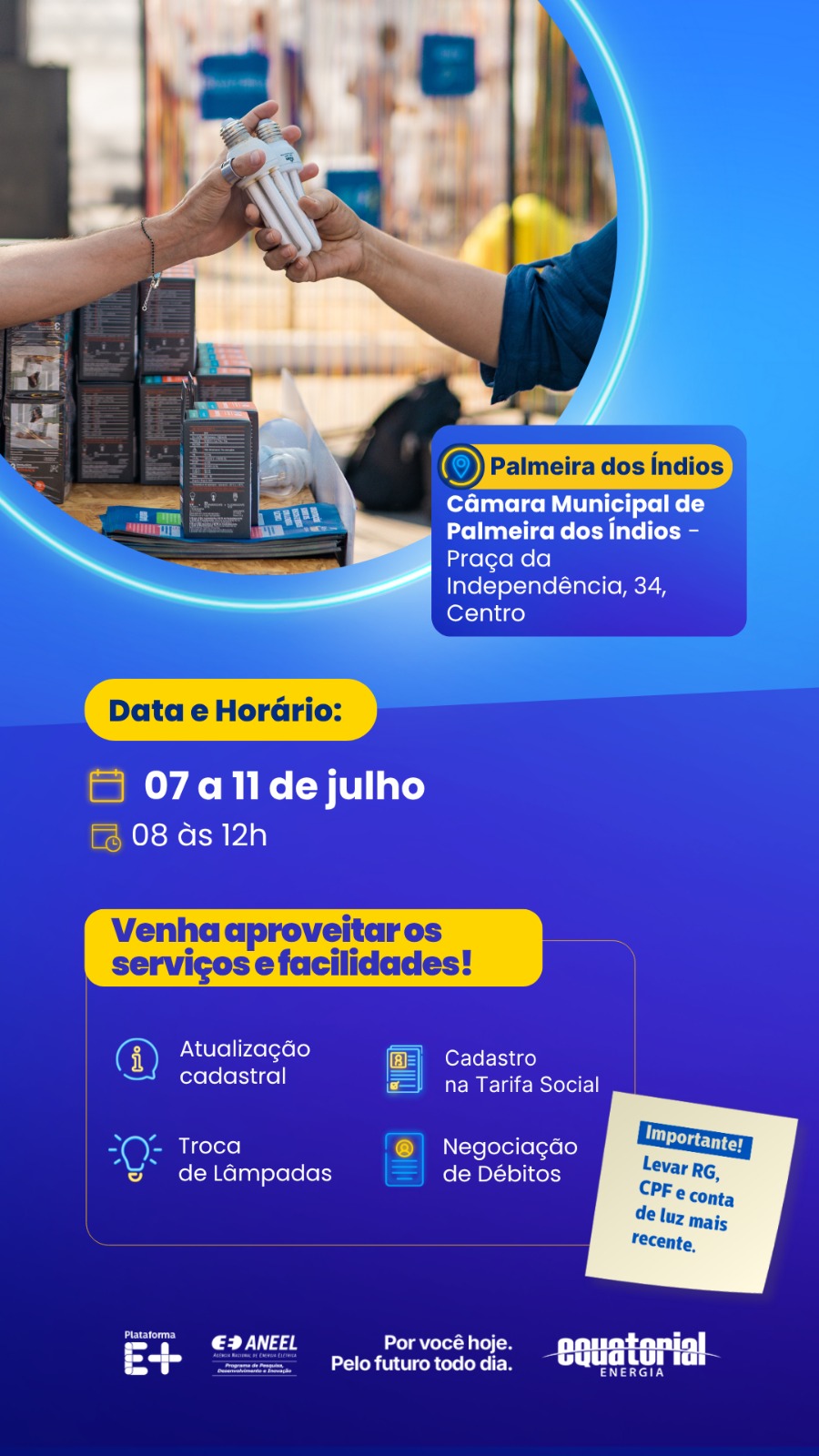 Entre os dias 7 e 11 de julho, a população de Palmeira dos Índios está tendo acesso a diversos serviços gratuitos em um mutirão promovido pela Equatorial Energia, em parceria com a Câmara Municipal, por meio da Plataforma E+ e com apoio da Agência Nacional de Energia Elétrica (Aneel). A ação acontece das 8h às 12h, na sede da Câmara, localizada na Praça da Independência, nº 34, no Centro da cidade.