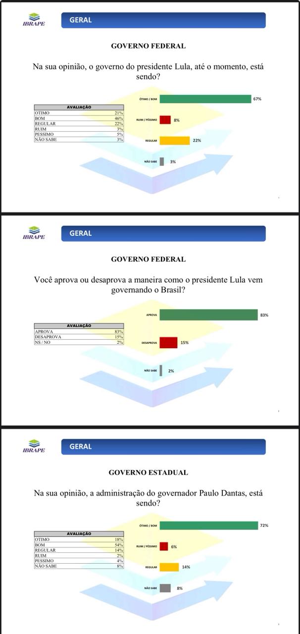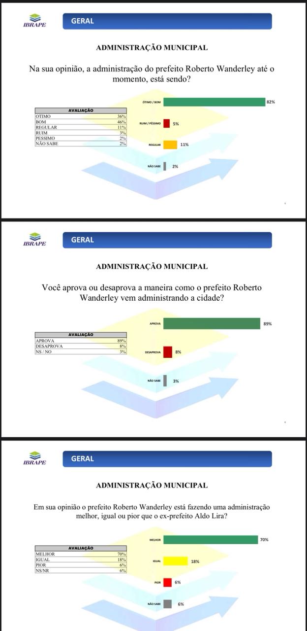De acordo com o levantamento, 82% dos entrevistados consideram a gestão ótima ou boa, enquanto apenas 5% avaliam como ruim ou péssima. Além disso, 89% aprovam a maneira como o prefeito vem administrando a cidade, e 70% afirmam que Roberto Wanderley faz uma gestão melhor do que a do ex-prefeito Aldo Lira.