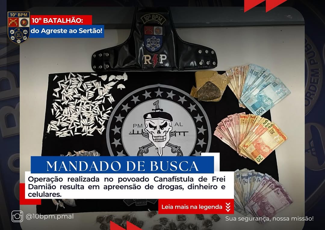 Na manhã deste sábado (4), uma operação conjunta entre equipes do 10º Batalhão de Polícia Militar (BPM) e da 5ª Delegacia Regional de Polícia (DRP) resultou na apreensão de uma grande quantidade de drogas e dinheiro no povoado Canafístula de Frei Damião, zona rural de Palmeira dos Índios.