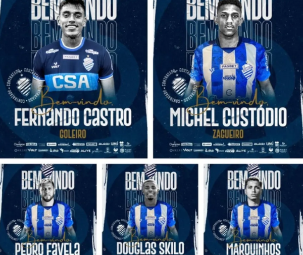 Nesta sexta-feira (03), o CSA anunciou cinco jogadores que integrarão o elenco azulino em 2024. A direção azulina confirmou as contratações do goleiro Fernando Casto, ex-Hercílio Luz-SC; volante Pedro Favela, ex-São José-SP; zagueiro Michel Custódio e os atacantes Douglas Skilo e Marquinhos, que estavam no Volta Redonda-RJ.