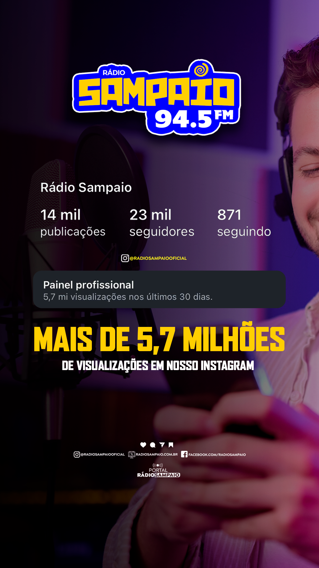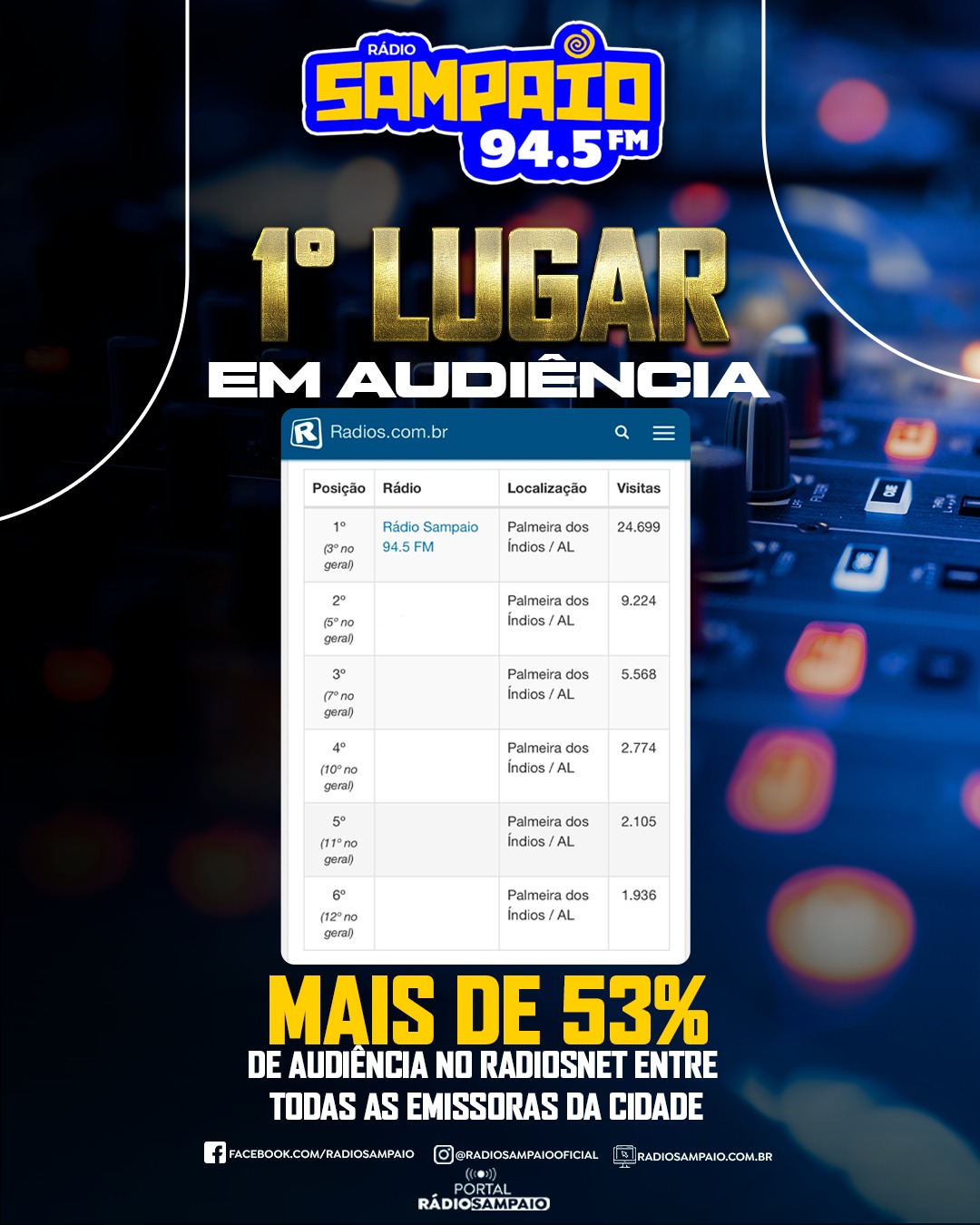 A Sampaio não é apenas uma emissora de rádio, é uma marca registrada na comunicação - e com sua credibilidade e responsabilidade vem se mantendo na liderança. Além daquela tradicional audiência através do rádio, que vem desde o AM até a transição para 94,5 FM, somos lideres também no aplicativo Rádios Net.