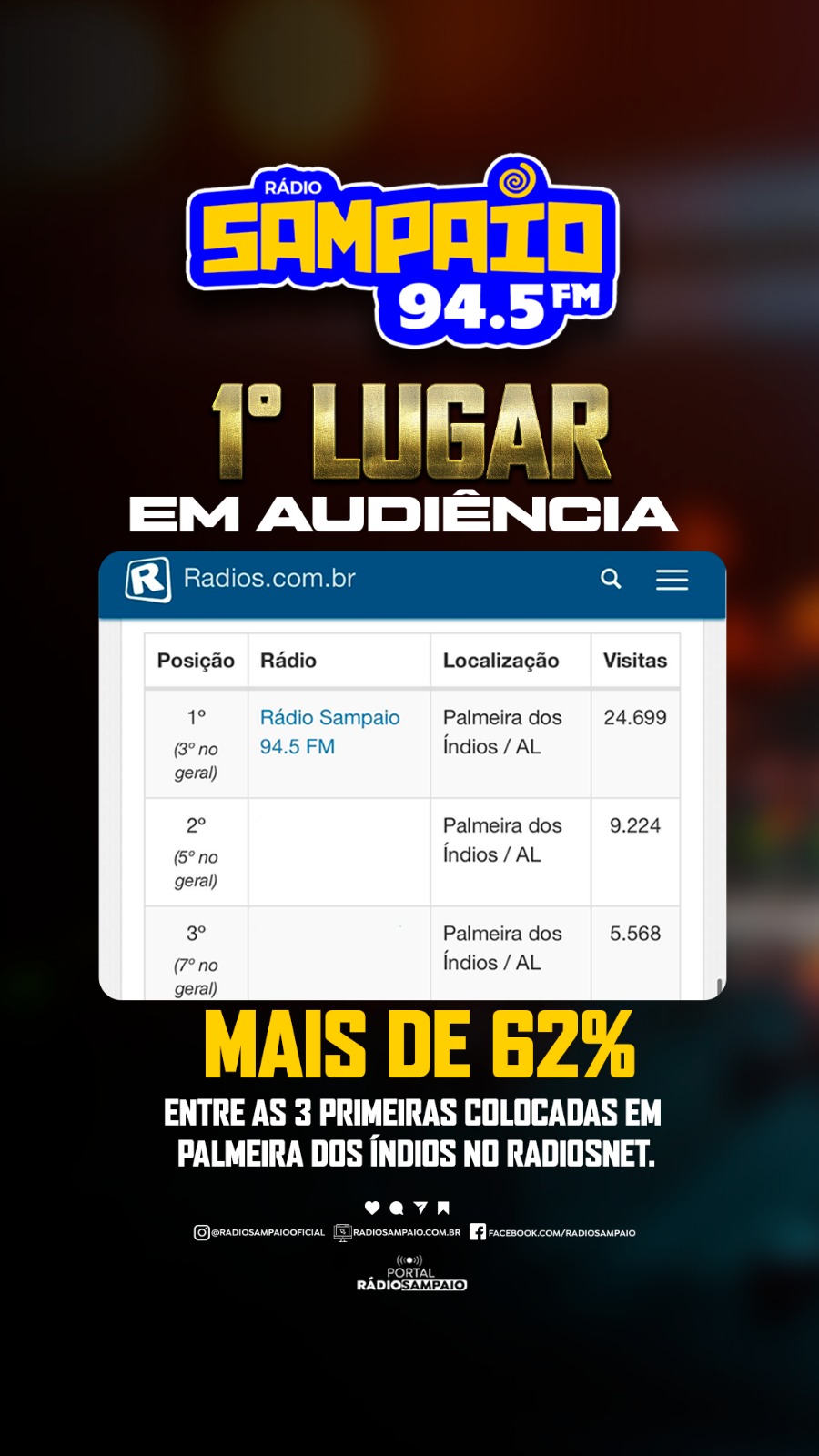 De acordo com os últimos números, foram 24.699 visitas a Rádio Sampaio. E sejam todos bem vindos a casa, ouvintes/internautas. A emissora que ficou na segunda colocação recebeu 9.224 visitas e a 3ª colocada 5.568. Isso significa mais de 62% da audiência entre as três primeiras colocadas. Quando são colocadas as 6 emissoras da cidade, o percentual é de 53%. Nossa responsabilidade só aumenta a cada dia, mas só temos agradecer.