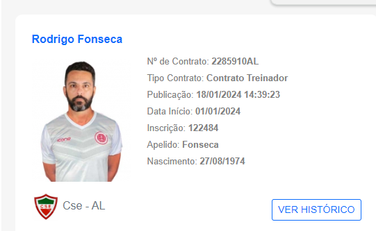Esta será a primeira passagem de Rodrigo Fonseca, 51 anos, pelo futebol de Alagoas. Na carreira, ele conta com passagens pelo Vitória da Conquista e Barcelona de Ilhéus (BA), Itabaiana (SE), Botafogo (SP), Desportivo Ferroviário (ES), entre outras equipes.