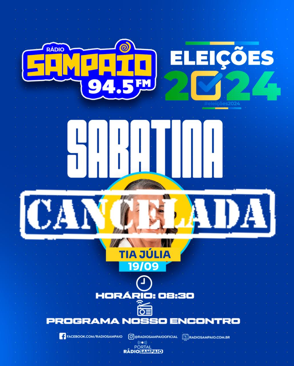 Apesar de ter confirmado sua participação, a candidata Tia Júlia (MDB) não compareceu à sabatina promovida pelo programa Nosso Encontro, da Rádio Sampaio (94,5), na manhã desta quinta-feira (19).