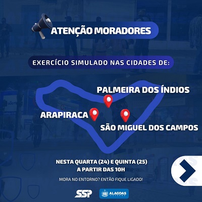 Além de Palmeira dos Índios, os exercícios também devem ser realizados nas cidades de Arapiraca e São Miguel dos Campos, nos mesmos dias e horários.