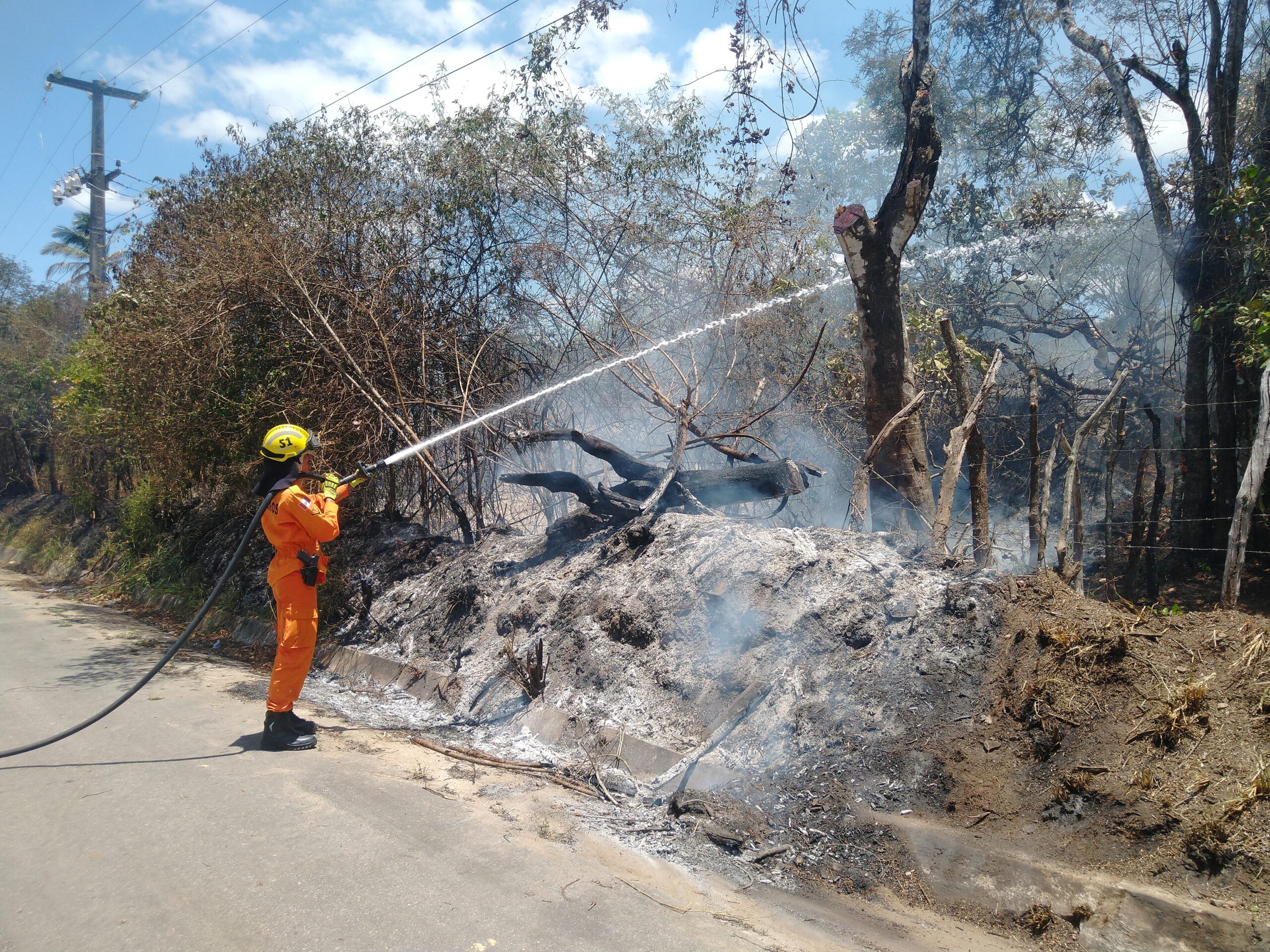 Bombeiro apagando fogo na vegetação | Foto: Pedro Ivon/Portal Rádio Sampaio