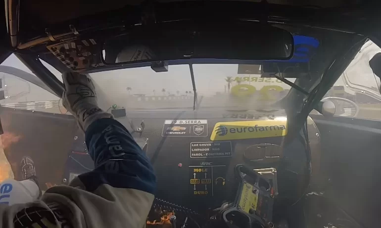 O carro do Team RC, conduzido pelo piloto Daniel Serra, pegou fogo durante um treino da Stock Car, no último sábado (26), em Goiânia (GO). Não foi informado o que provocou as chamas, que surgiram próximas aos pés do piloto. O ocorrido foi registrado por uma câmera interna do veículo.