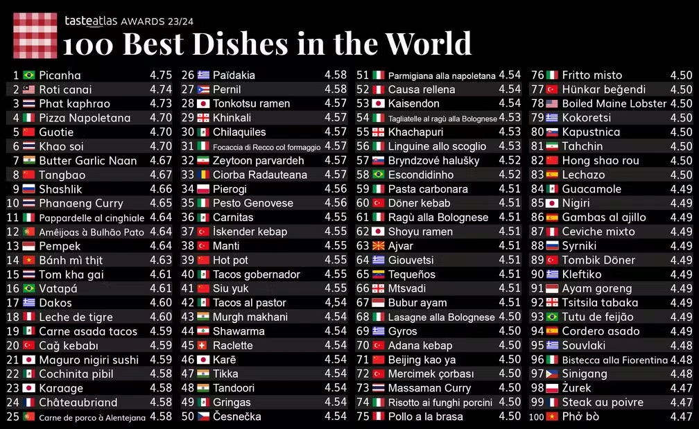 A picanha brasileira foi eleita o melhor prato do mundo no ranking do guia TasteAtlas, divulgado nesta terça-feira (12). A carne recebeu 4,75 de 5 estrelas em avaliações de usuários do site e ficou à frente do roti canai, pão folhado da Malásia, phat kaphrao, carne da Tailândia.